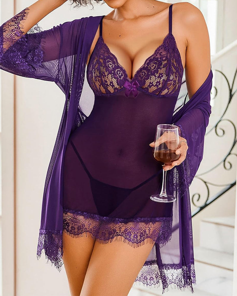 Sexy 3-Piece Lingerie Set for Women – Mesh Kimono Robe & Lace Babydoll Dress
