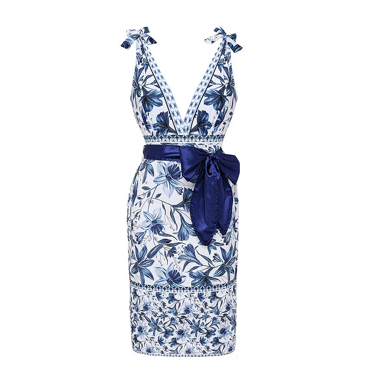 FLAXMAKER Blue and White V Neck Lace Up Strip Plant Prints One Piece Swimsuit and Skirt/Sarong