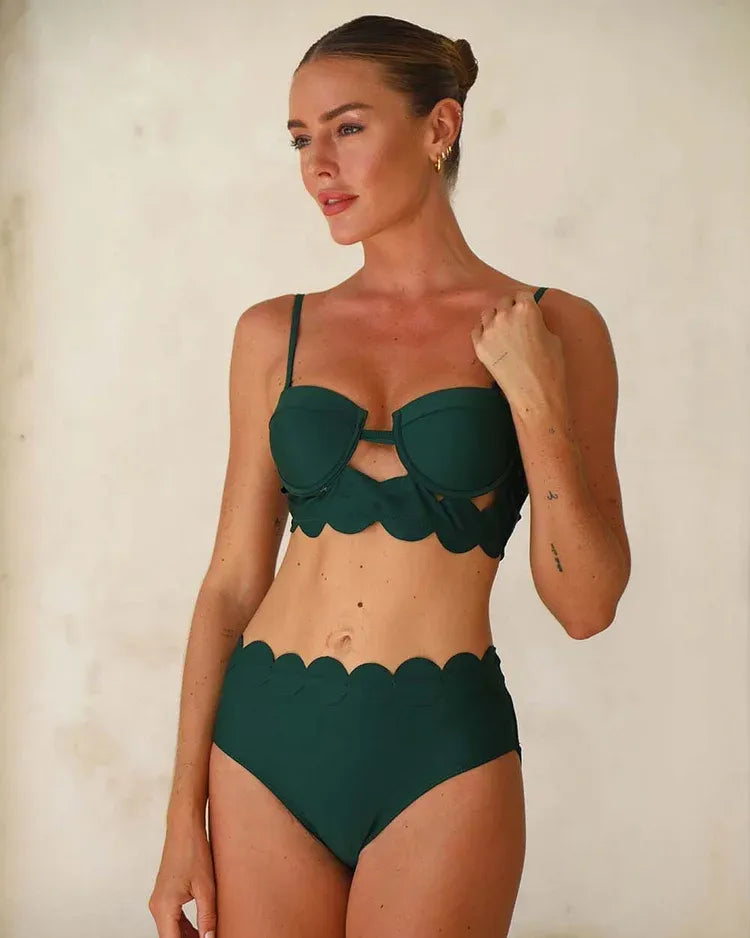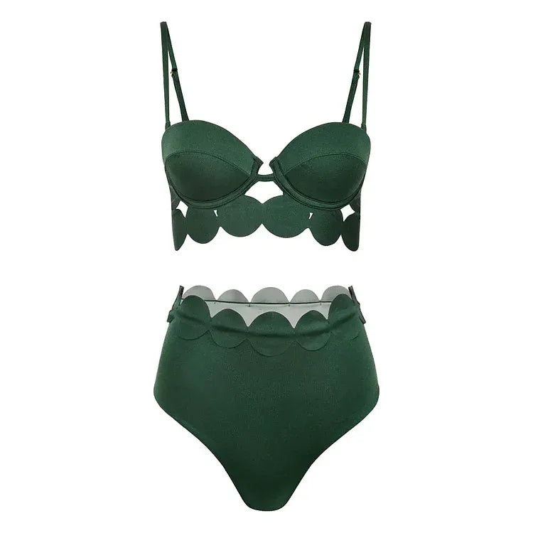 Elevate your summer style with our High-Waist Elegance Trio - the ultimate fusion of retro glamour and modern comfort. Designed for the confident fashionista, this emerald green bikini set redefines beachside sophistication with its figure-flattering silhouette and graceful coverage.