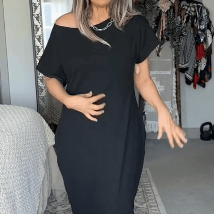 Designed with a chic off-shoulder neckline and relaxed batwing sleeves, this dress offers a roomy, flowy fit with graceful movement. The maxi length skims the body without clinging, while discreet side pockets keep essentials close. Universally flattering, wrinkle-resistant, and easy to pack, it’s perfect for daily wear or vacation getaways.